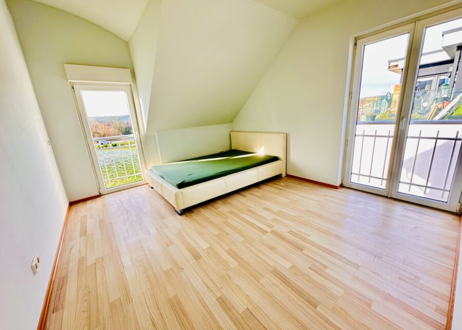 Im Ober·geschoss gibt es zwei Balkone.