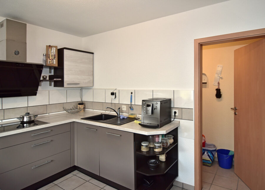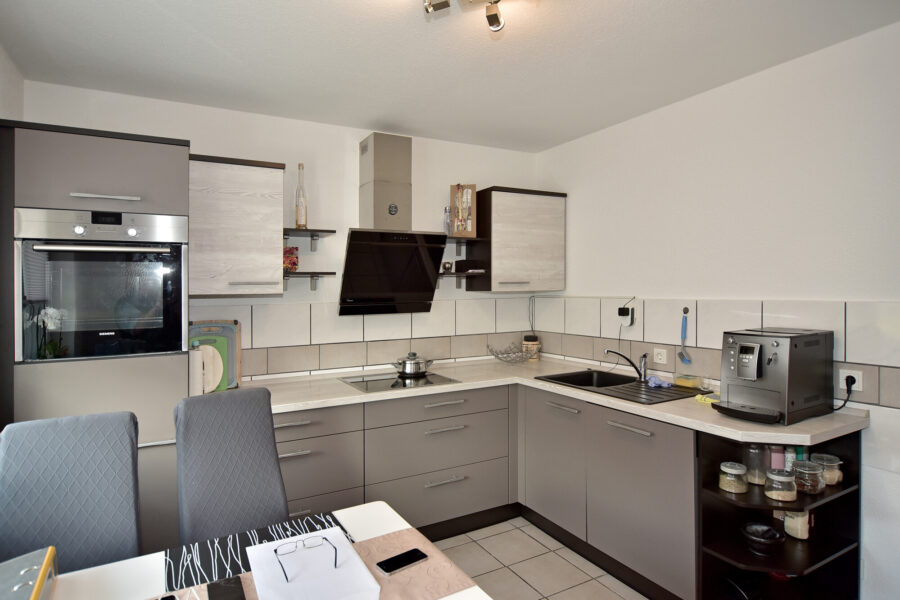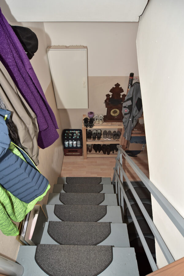 Im Erd·geschoss gibt es eine Küche und ein Wohn·zimmer.