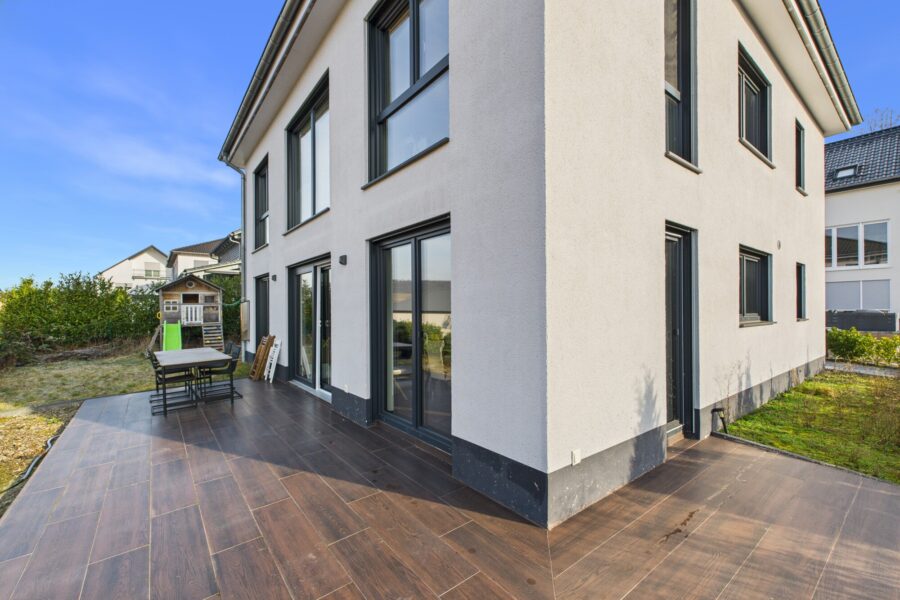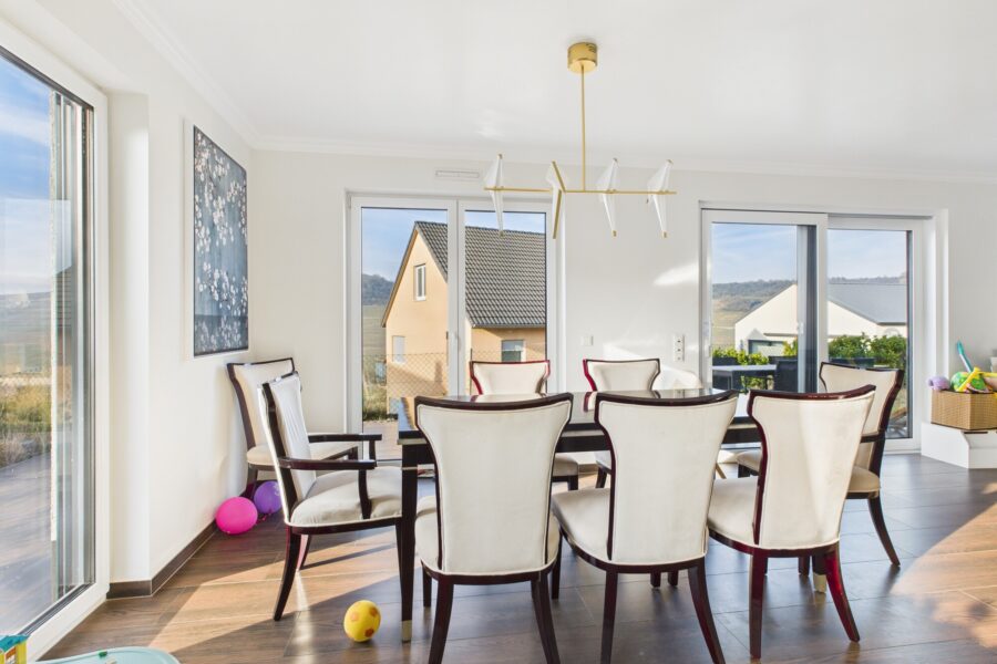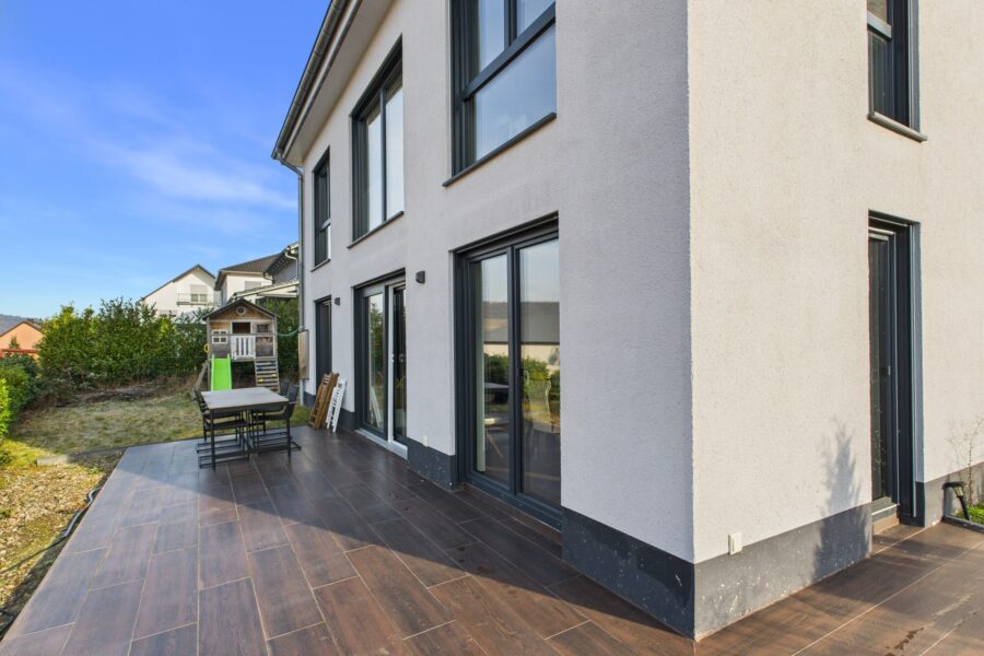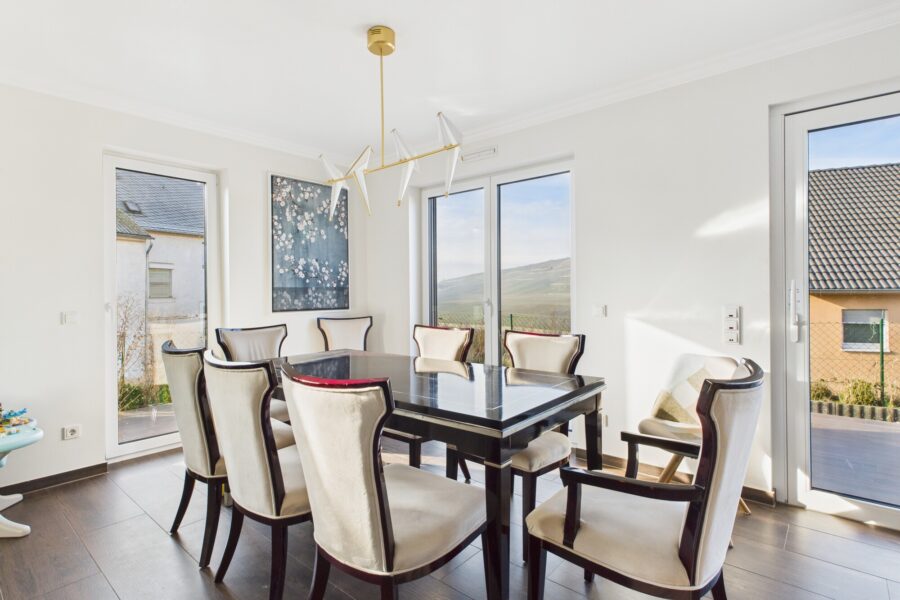 Die Blickrichtung des Hauses ist nach Westen ausgerichtet, hin zur Mosel und zur Luxemburger Route du Vin mit den leicht hügeligen Weinbergen. Nicht umsonst sind der Garten wie auch die Türfenster im Erdgeschoss und Obergeschoss dorthin ausgerichtet. Für Genießer der Ruhe wird die Nacht ohne künstliche Beleuchtung im Garten eine optische Freude sein.