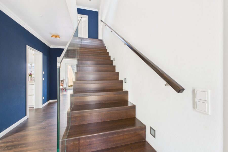 Der Immobilienmakler hat den Auftrag, nach jeder Präsentation die elektrischen Fensterläden an allen Fenstern bitte zu schließen. Das mache ich gerne, denn dazu brauche ich nur einen Schalter zu betätigen. Und ich genieße die Stufen der seitlich beleuchteten Treppe vom Erdgeschoss ins obere Stockwerk.