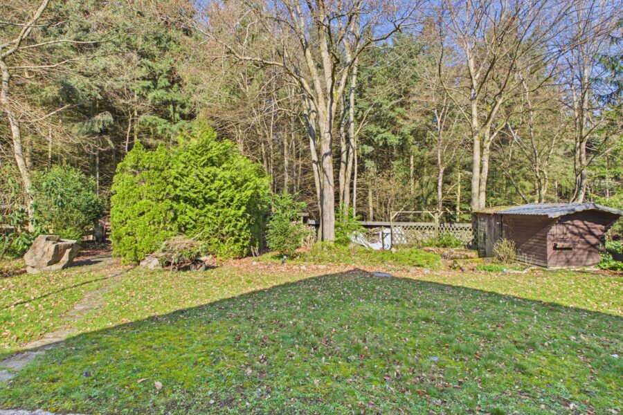 Hinter dem Garten ist der Wald.