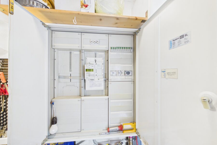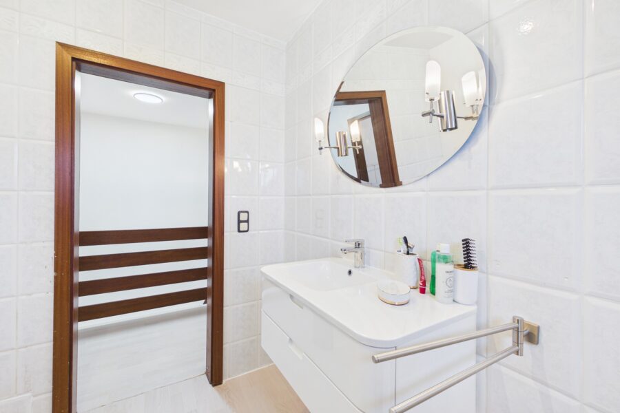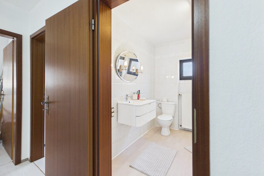 Und ja, die aktuellen Eigentümer haben nicht nur den Boden des Erdgeschosses dreifach gedämmt. Sie haben überall neue Parkettböden verlegt. Sie haben die Küche inkl. Elektrogeräte neu eingerichtet. Und sie haben das Badezimmer vollkommen modernisiert.