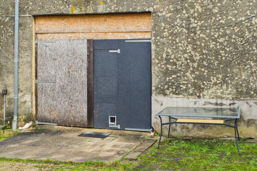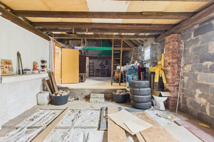 Die Scheune bräuchte sicherlich eine Absenkung des hinter ihr verlaufenden – wohl ohne Drainage ausgestatteten – Gartens. Doch die Wände stehen, die Struktur steht, die Zukunft kann ohne Veränderung der Gegebenheiten einziehen. Wenn Sie es wollen.